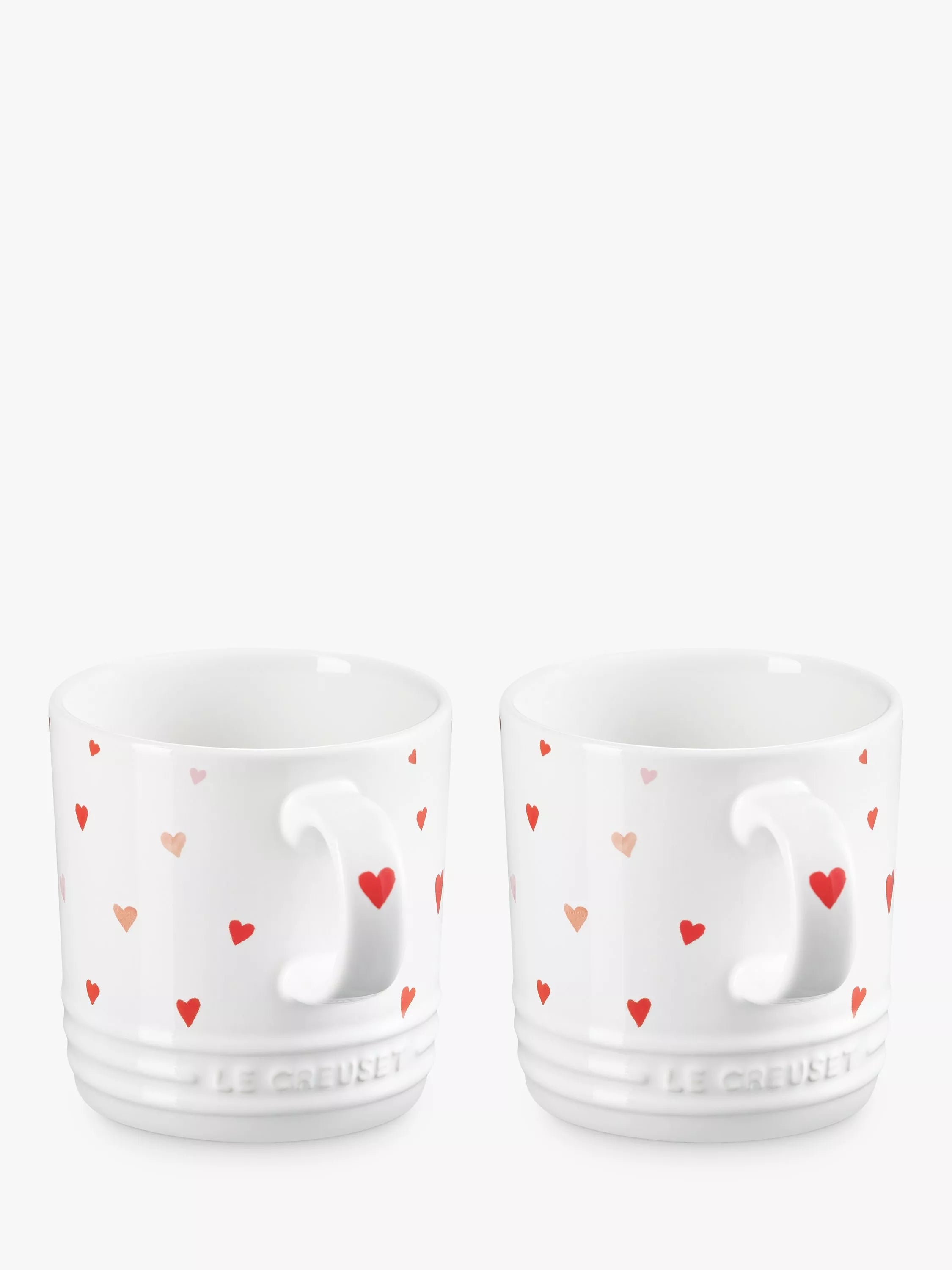 Dieses Paar Steingutbecher, die als Geschenkidee dienen, ist Teil der Le Creuset Heart Decal Kollektion und ist mit roten und rosa handgemalten, aquarellartigen Herzen auf weißem Hintergrund verziert.