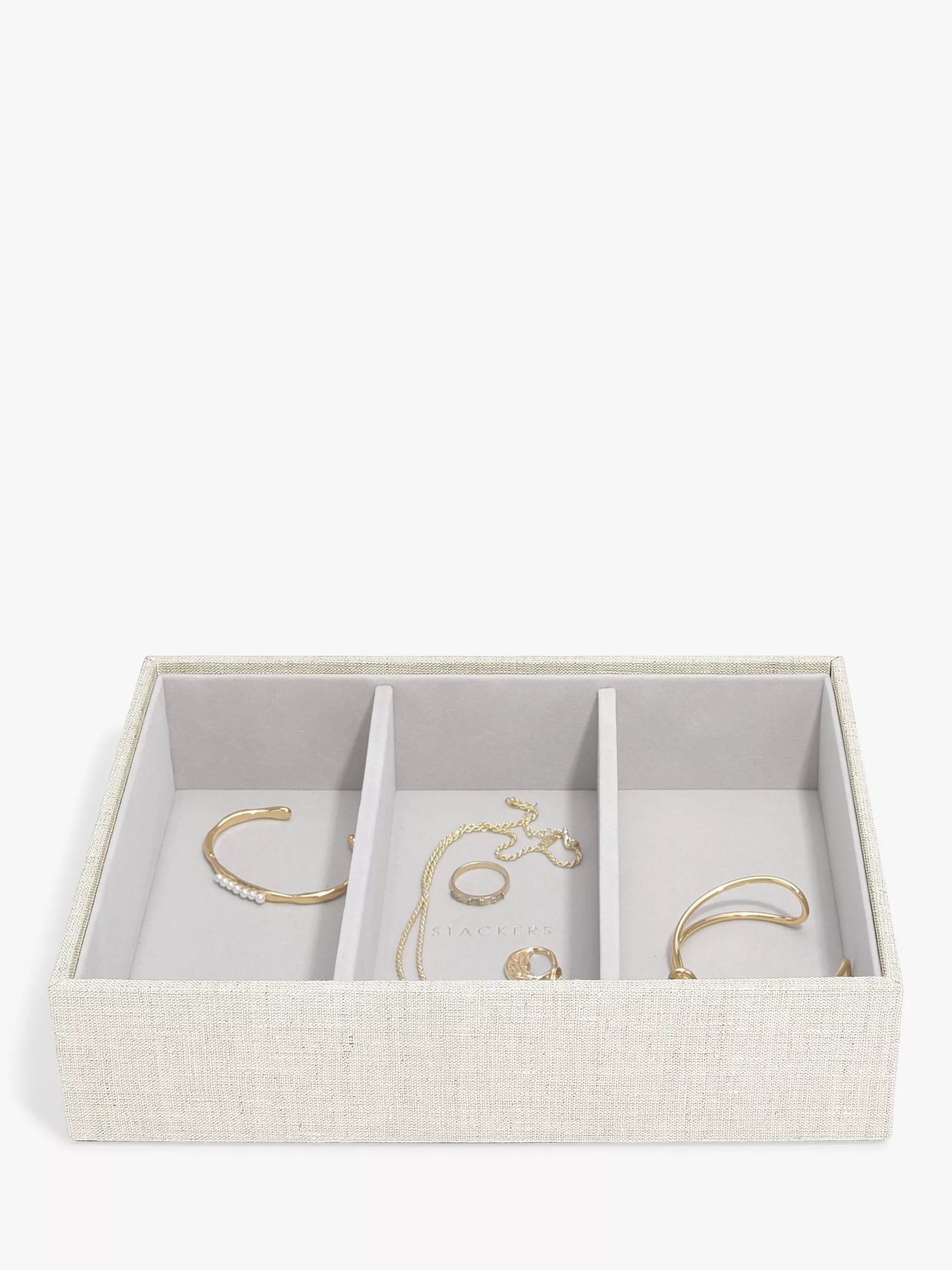 Die Uhren- und Accessoires-Ebene ist eine tiefere Ebene, die in drei Fächern Platz für Uhren und größere Accessoires bietet. Ergänzen Sie Ihre Stackers-Schmuckbox mit dieser Ebene oder nutzen Sie sie separat auf einer Kommode oder in einer Schublade. Für noch mehr Aufbewahrungsmöglichkeiten können Sie außerdem eine Ringrolle, eine Uhrenunterlage oder eine mittelgroße Reise-Schmuckbox hinzufügen, um Ihren Schmuck sicher zu verstauen.