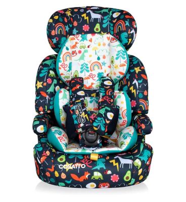 Cosatto Zoomi car seat has a five-point safety harness with quick release buckle for home time. With layers of padding plus tummy pad, chest pads and comfy padded arm rests, this toughie's a softie too.