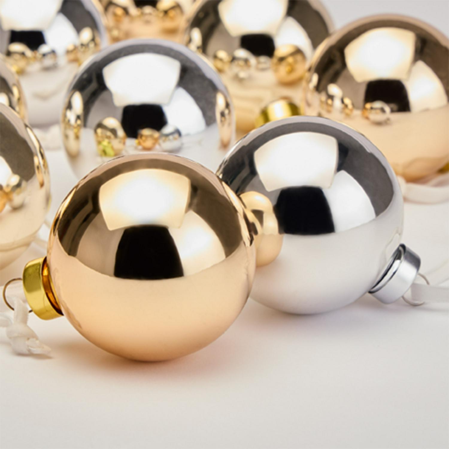 Capture the festive spirit this season with this set of 9 Habitat Christmas baubles in contrasting colours. These ornaments feature a glossy glass surface designed to reflect light beautifully across your tree. Enjoy the superior shine and traditional aesthetic offered by this mixed gold and silver assortment for your decorations.