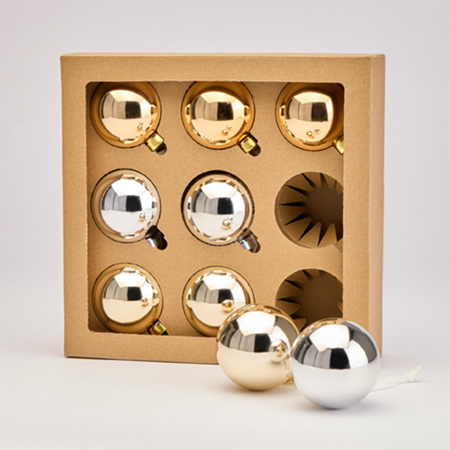 Read MoreCapture the warmth of Christmas with this pack of 9 gold and silver baubles. Watch the reflections dance across their glossy glass surface and enjoy the superior shine. With pre-threaded hanging loops, it’s easy to decorate the branches.