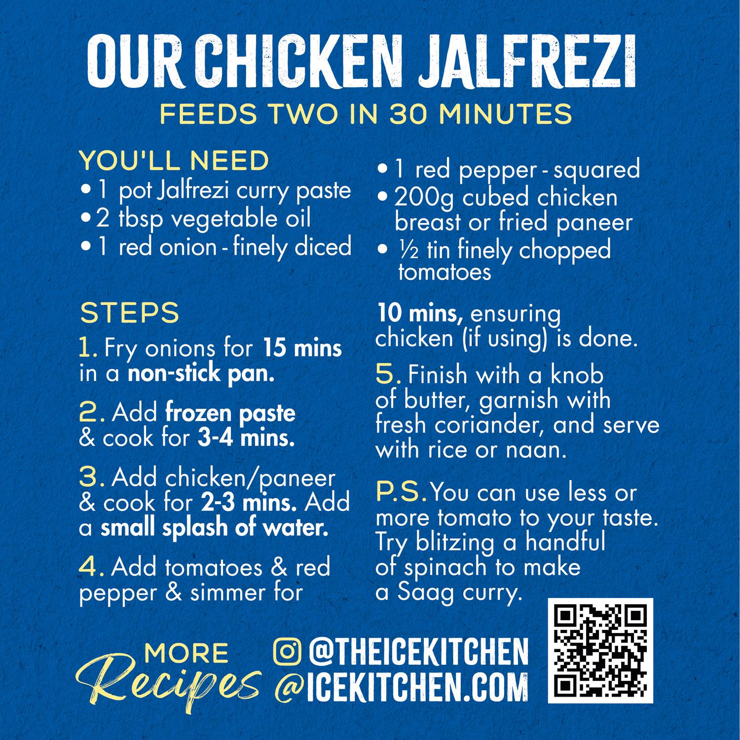 Indian curries call for specific combinations of fresh and dry ingredients added in distinct stages – a culinary challenge for a frozen paste… but we’ve cracked it! Fresh garlic, ginger, and green chillies are blended with 14 different spices to create an intensely layered and vibrant Jalfrezi Curry paste. Fabulously versatile, our paste lends itself to creativity: experiment with different proteins (meat, eggs, paneer) and veggies or ramp up the tangy sauciness by adding extra tomatoes. For a whole new dish, blitz spinach with the tomatoes to create a flavour-packed saag curry.