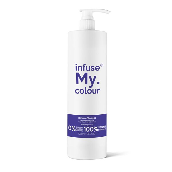 the perfect product to use in between visits to the salon and ensures optimum brightness in the hair creating beautiful platinum icy effects infuse my colour platinum shampoo offers platinum tones to cool down yellowgold colours in coloured pale yellow hair if your hair is coloured grey or naturally grey infuse my colour platinum shampoo will add platinum tones to your grey hair for bleached hair this product will add icy platinum tones and neutralize unwanted gold or yellow colours 100 vegan formula 0 sulphates 0 silicones 0 parabens apply a generous quantity of infuse my colour shampoo around double the quantity you would use of regular shampoo evenly rinse and repeat the shampoo procedure and follow with infuse my colour treat conditioner to comb through and rinse infuse my colour products have instant results so you can style your hair as normal once washed