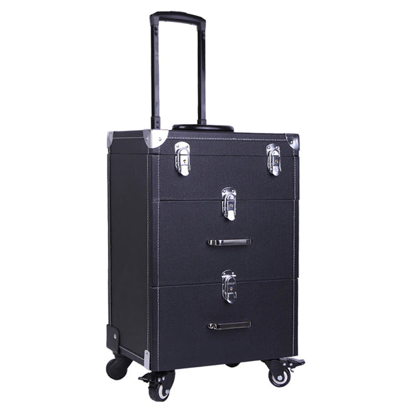 sturdy construction with corner protectors smooth rolling wheels make this case super portable lockable latches prevent item loss for enhanced security specifications overall size 36 w x 23 d x 49 h material pu leather metal compartments yes drawers included yes number of drawers 2 wheel included yes number of wheels 4 assembly required yes package content 1 x cosmetic travel case package specifications package dimensions wxdxh 63 x 41 x 325 gross weight 85kg