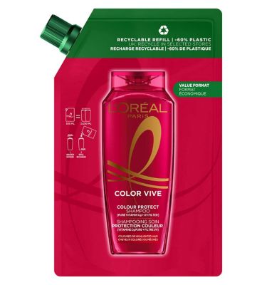 Read MoreOur refill pouch uses 60% less plastic*. Coloured or Highlighted hair? Preserve the intensity and vibrancy of your first-day colour for up to 40 washes** with Elvive Colour Protect Shampoo, by L'Oréal Paris. The formula is powered with [Pure Vitamin Cg*** + UV Filters] to help protect your colour and shield your hair against UV aggressors. Suitable for all hair types and textures. *Refill pouch uses 60% less plastic vs x2 of our 250ml shampoo bottles. **instrumental test shampoo + conditioner. ***vitamin c derivative.