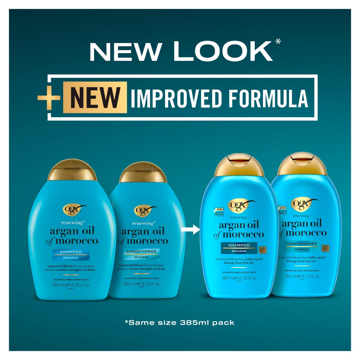 Discover OGX hair care - with improved patented formulas proven to give you visibly healthier hair in just one use* The formulation OGX conditioner featuring OGX Lipi Pro Shield, boasts a formula rich in nourishing lipids and carefully selected moisturizing agents that respect the protective lipid and protein barrier for strong, beautiful, and healthy feeling hair. Repair and strengthen dry, damaged hair with this Argan Oil of Morocco conditioner. A powerful blend that visibly repairs damage.Its potent formula crafted to help repair dry and damaged hair consists of Argan Oil of Morocco. It further helps to intensively hydrate hair and lock in moisture for impeccably smooth and silky hair. It also targets damaged and brittle hair strands to strengthen them and reveal strong, shiny and healthy-looking hair that is easy to manage and detangle.This conditioner for dry hair, with sulfate-free surfactants, is gentle on your hair and will help to strengthen and smooth to release your hair's silkiest potential. For absolute results, use OGX's Argan Oil of Morocco Shampoo and Conditioner together. For even deeper nourishment, follow the entire OGX hair hydration hair care routine: Shampoo, Conditioner, Hair Oil, Hair Mask and Heat Protection Spray.Get ready for beautifully soft, strong and shiny hair.*Vs non-conditioning shampoo, with continuous use when using both shampoo and conditioner.