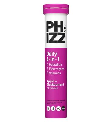 Phizz Apple & Blackcurrant tablets feature a science-led formula designed to improve hydration efficiency. This effervescent drink mix hydrates three times faster than plain water alone. It combines essential electrolytes and comprehensive multivitamins for enhanced daily support.