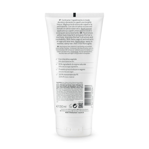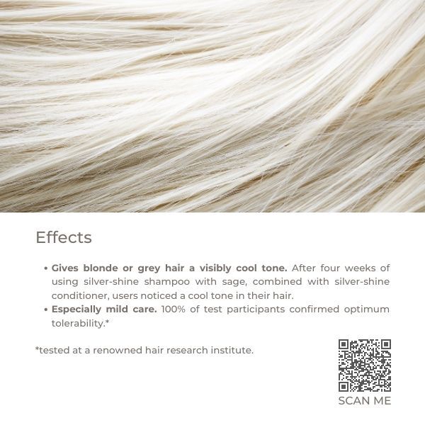 Goodbye, yellow hues: this neutralising conditioner keeps the tone of blonde, bleached, or grey hair cool. Turn thin, weak hair into luscious locks in no time! The Silver-shine conditioner with sage neutralises unattractive yellow hues in blonde or grey hair thanks to its purple pigments. In addition, it pampers bleach-damaged hair with restorative nutrients, courtesy of the experts in Kreuzlingen near Lake Constance, who have enriched this purple nourishment booster with innovative plant keratin. This ensures that hair breakage soon becomes a thing of the past, leaving hair easy to comb, supple, and noticeably stronger. The creamy formula is free from silicone, completely vegan, and made with 95% ingredients of natural origin, including Swiss sage oil, sage extract, and aloe vera. As you condition your hair, the Silver-shine conditioner emits a mildly spicy scent with notes of lavender, rosemary, and pine, transporting you to the holidays in Provence. Anti-yellow conditioner for blonde or grey hair Contains plant keratin for stronger hair structure Made in Switzerland with Swiss sage oil and extracts of sage and aloe vera produced in-house Free from silicone, vegan, and made with 95% ingredients of natural origin Packaging made from 100% recyclable mono-material