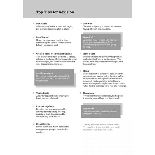 A5 revision notebook containing 160 pages of quality, educational grade paper in 4 colour-coded sections. Featuring a 14 page revision guide with tips and templates for effective revision and planning, including study layouts, guides and templates. Wirebound with durable laminated covers. This notebook is developed with teachers for efficient revision.