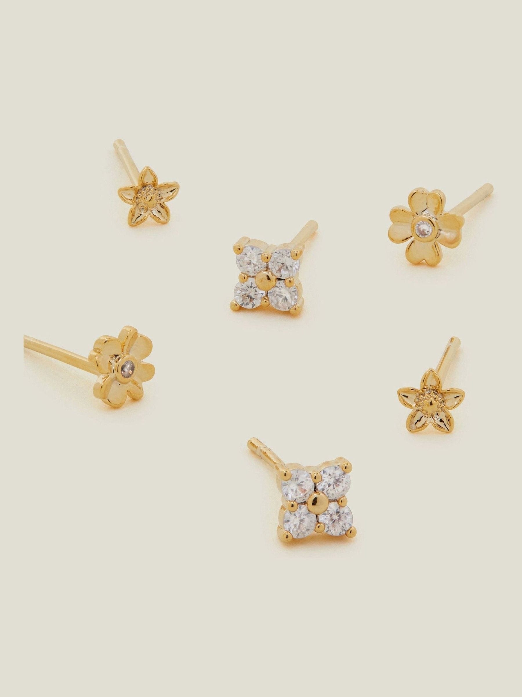 Part of the Z by Accessorize collection. Add fun, floral accents to your earscape with this dazzling trio. Featuring three pairs of studs, each pair has different flower design and sparkly diamante embellishments. Plated in 14 carat gold for a luxe, longer-lasting finish. Non-refundable.