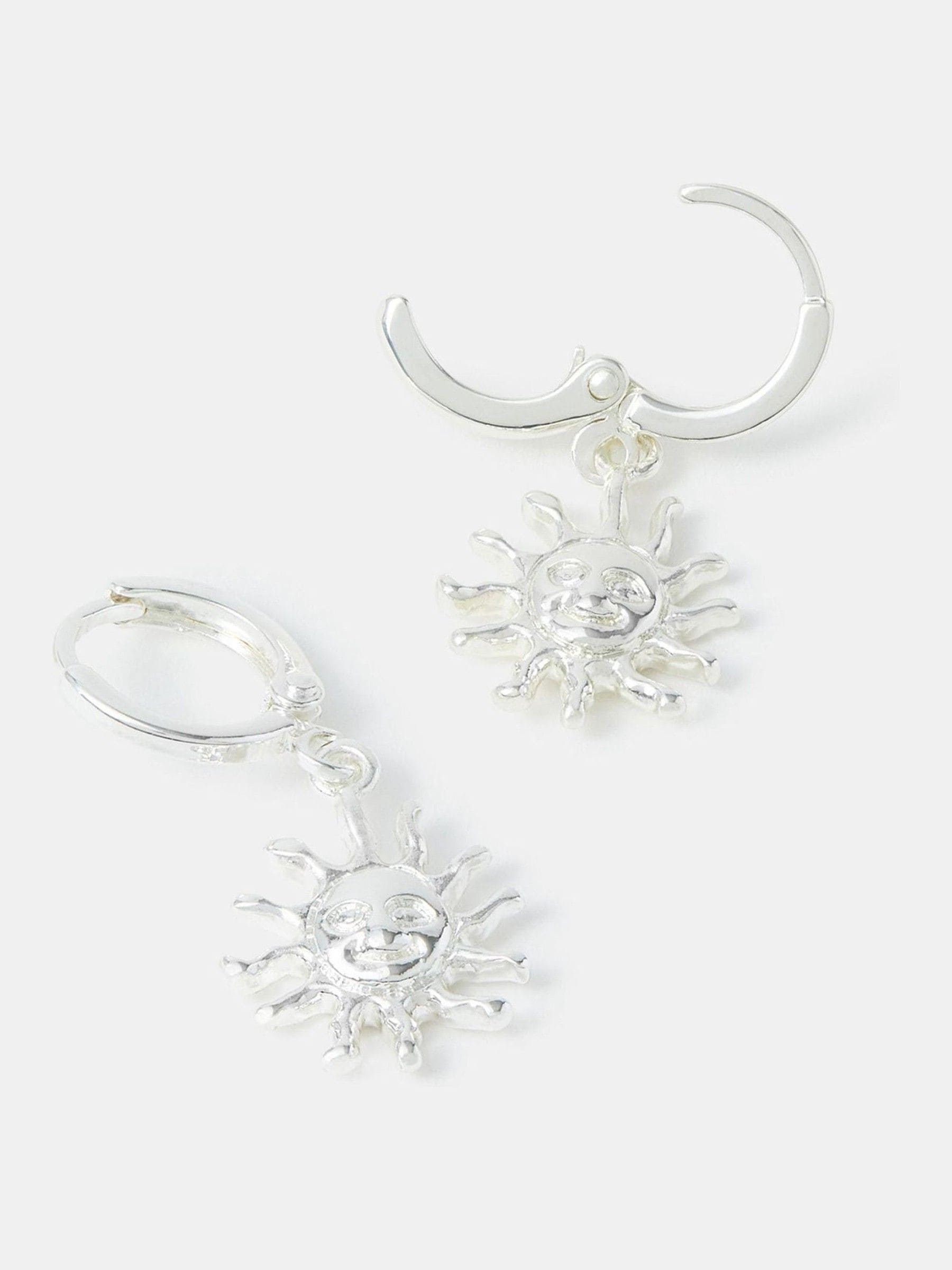 Sun worshippers: These earrings are for you! Dipped in sterling silver, these earrings feature a happy sun charm dangling from a clasp hoop profile.
