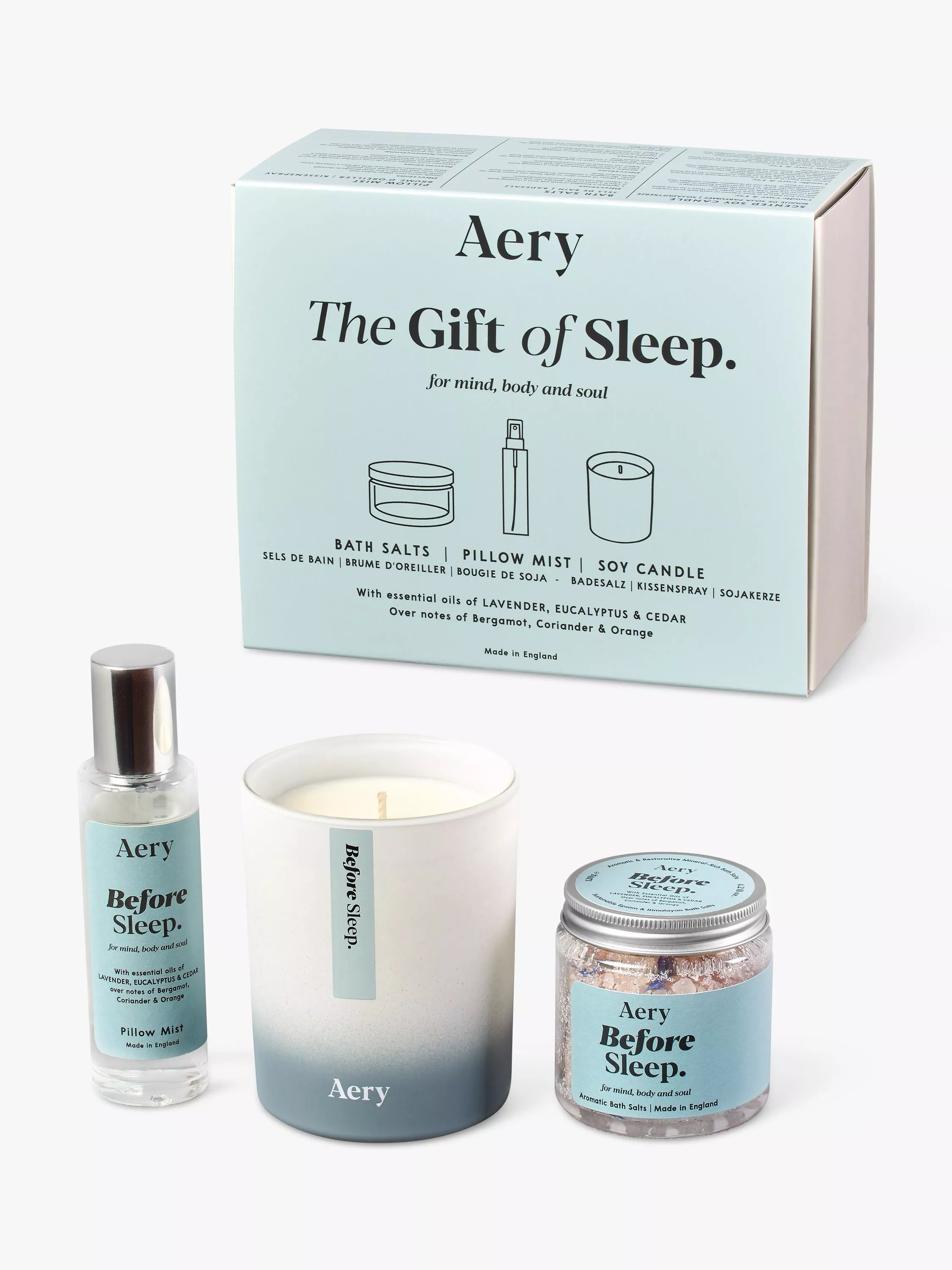 Bath Salts 100g, Pillow Mist 50ml, Votive Candle 80g all in dreamy Lavender, Eucalyptus & Cedar.