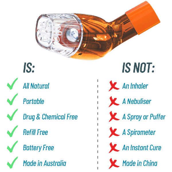 INTERNATIONALLY AWARD WINNING & Made in Australia, the drug-free handheld device is used to clear the airways, improve breathing and therefore potentially reduce symptoms in the following medical conditions: Asthma, Atelectasis, Bronchiectasis, Chronic Obstructive Pulmonary Disease (COPD) – Emphysema and Chronic Bronchitis, Cystic Fibrosis, Emphysema and many more respiratory conditions. (As featured on TV -Channel 7 News). The Children/ Low Lung Capacity device is suited to people with a range of respiratory conditions who may consider themselves 'extremely acute or extremely severe' and Children from 5 to 12 years old. NOTE: Children should be supervised and must be able to exhale into the device on command.
