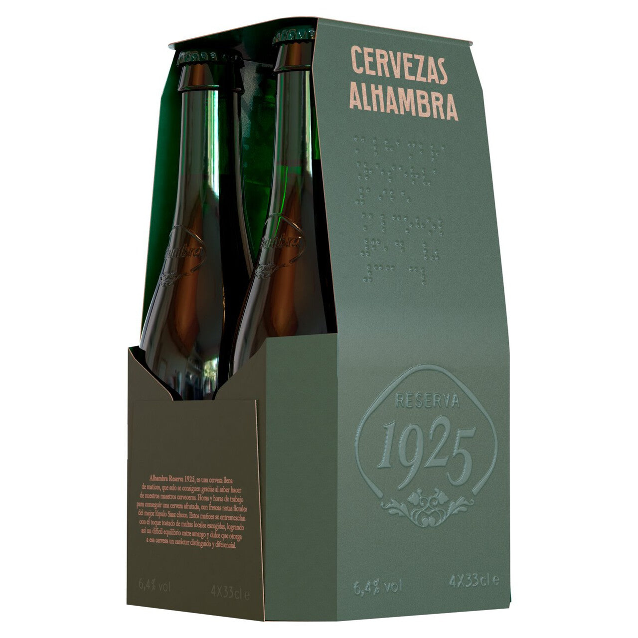 Discover Alhambra Reserva 1925, a distinguished beer crafted with meticulous care by expert master brewers. This 4-pack of 33cl bottles showcases a sophisticated presentation with a deep green label and metallic copper detailing. The careful selection of ingredients results in a complex yet smooth drinking experience.