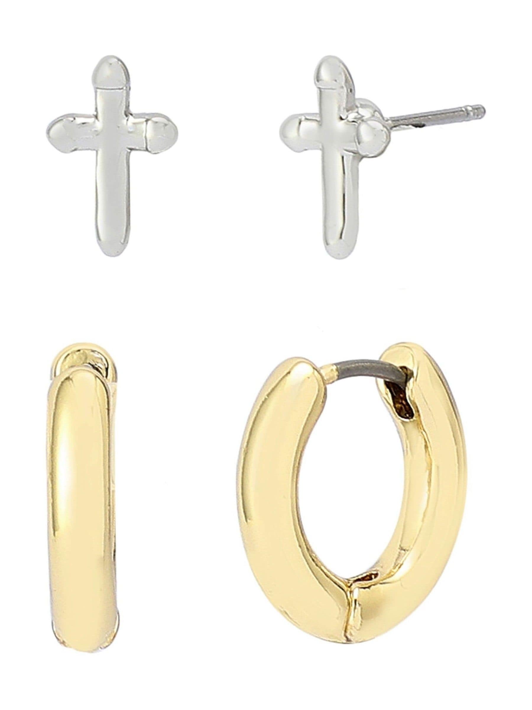 Sophisticated duo earring set featuring timeless cross motif studs paired with minimal huggie hoops perfect for everyday. Set includes 2 pairs of earrings in neutral two-tone finish with hypoallergenic stainless steel posts perfect for everyday. Earrings have post back and hinge closures. Made from metal and stainless steel. Dimensions - Length: 10-15mm, Width: 5-6mm, Diameter: 13mm.