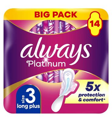 Read MoreAlways Platinum Sanitary Towels with ComfortLock wings are designed to give you better fit* for up to zero leaks, zero shifting and zero discomfort. With Always Platinum Sanitary Towels your period is the last thing on your mind. Always Platinum Day & Night (Size 3) with wings is recommended for day & night usage if you have medium or heavy flow. Always Platinum Day & Night has been redesigned to offer better day usage experience*. Try Always Platinum Secure Night (Size 4), Always Platinum’s best sanitary towels for overnight protection. *vs. product replaced