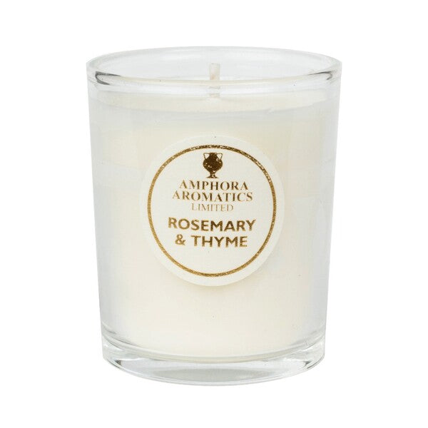 rosemary thyme 20hr pot candle in an attractive glass pot a reviving stimulating scent in an attractive ivory colour made from pure essential oils and 100 natural plant wax wax comes from a natural sustainable plant source our candles contain no petroleum based paraffin wax and animal products reuse the glass pot for tealights or trinkets to recycle the pot place in your normal clear glass recycle bin also available in a larger 40 hour pot as well as a reed diffuser vegan friendly