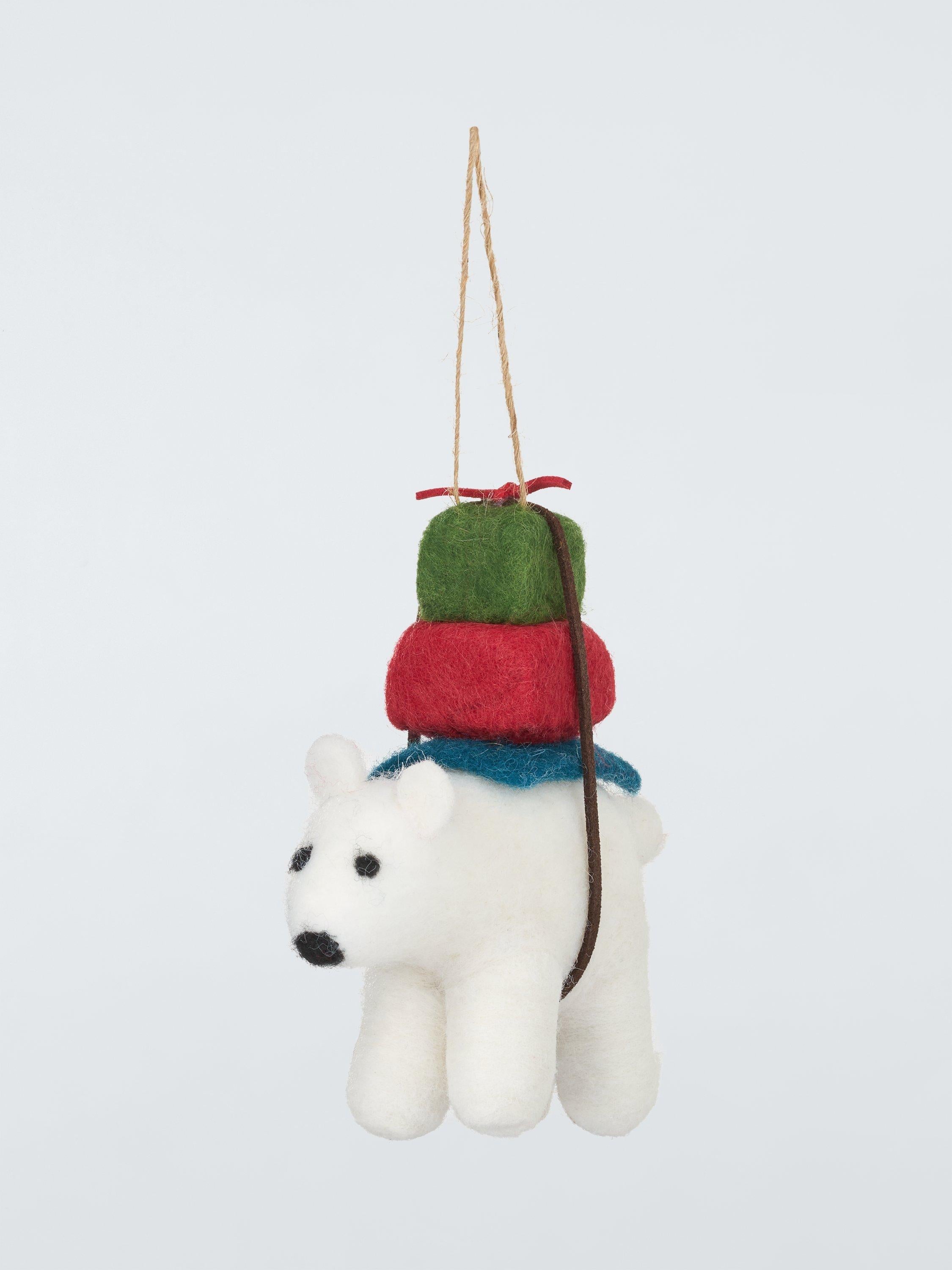 This Ancient Wonders tree ornament brings lovely holiday charm to your display. Made from soft felt material, this polar bear holds intricate little presents, adding texture. It is a delightful addition to your festive Christmas decorations this year. A unique heirloom piece ready now.