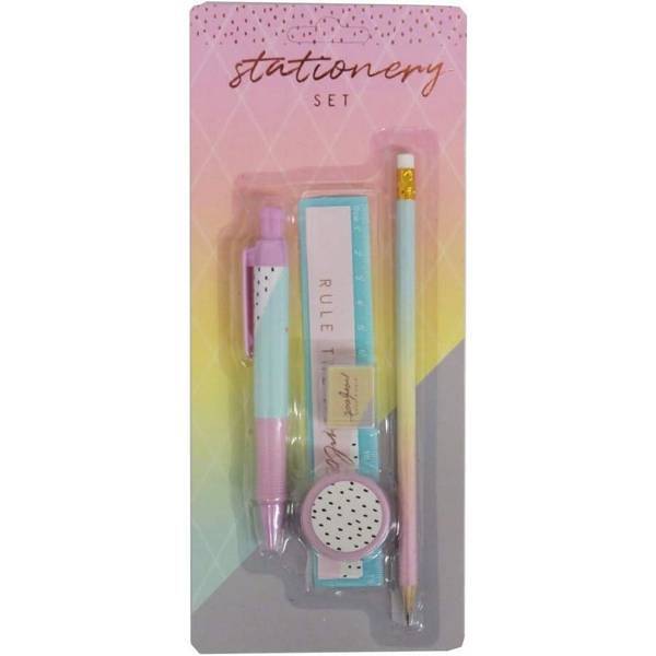 material plastic wood design contrast dotted text contents 1 eraser 1 pen 1 pencil 1 ruler 1 sharpener packaging backing card euro hook