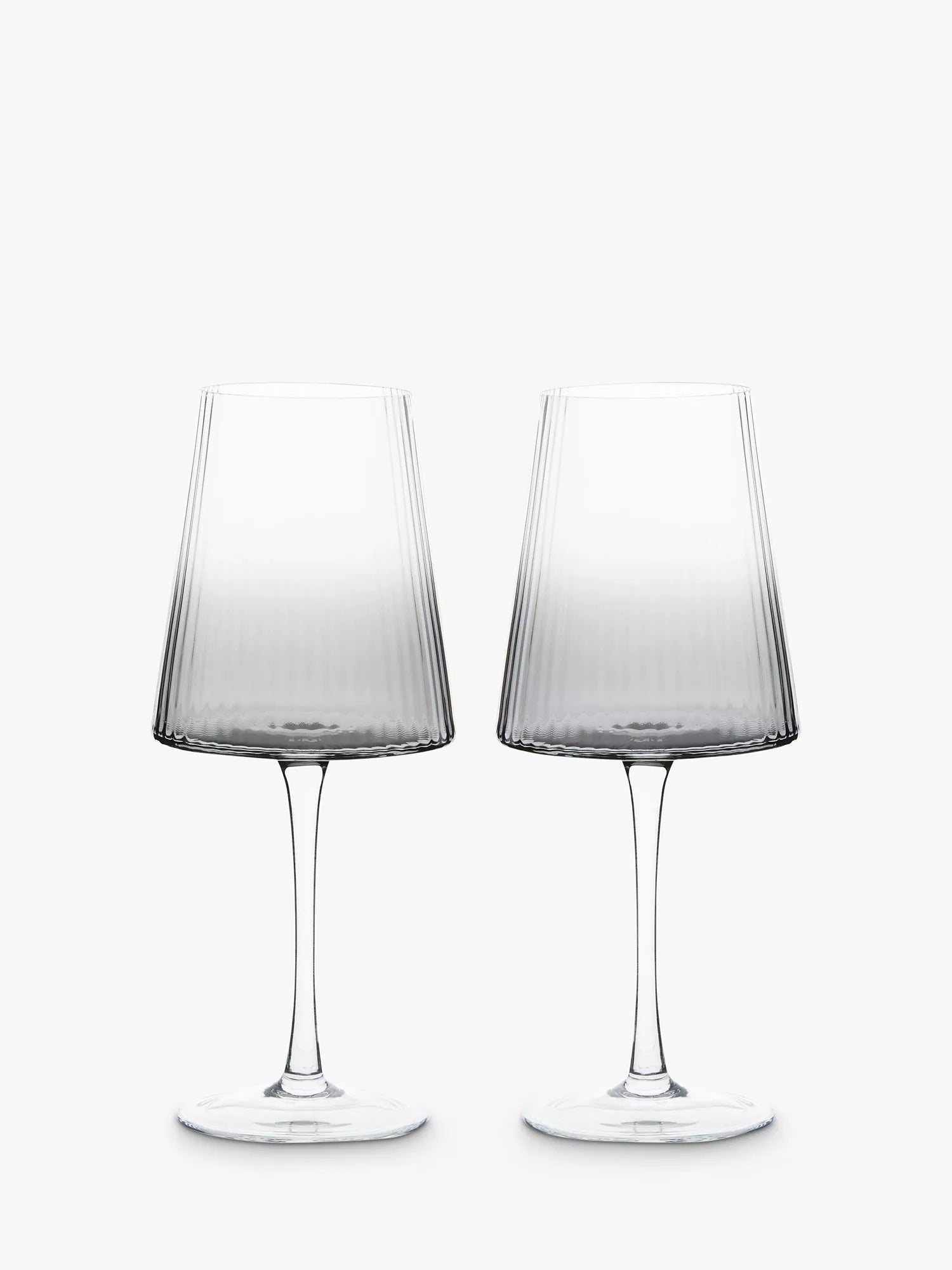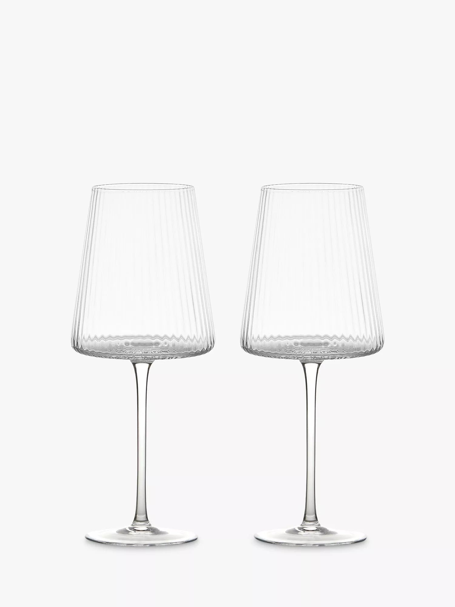 A pair of Empire wine glasses from Anton Studio Designs with contemporary-shaped bowls, rounded corners and fine optic ribbed texture. Mouth-blown and handmade by skilled craftsmen, they have tall, elegant stems.