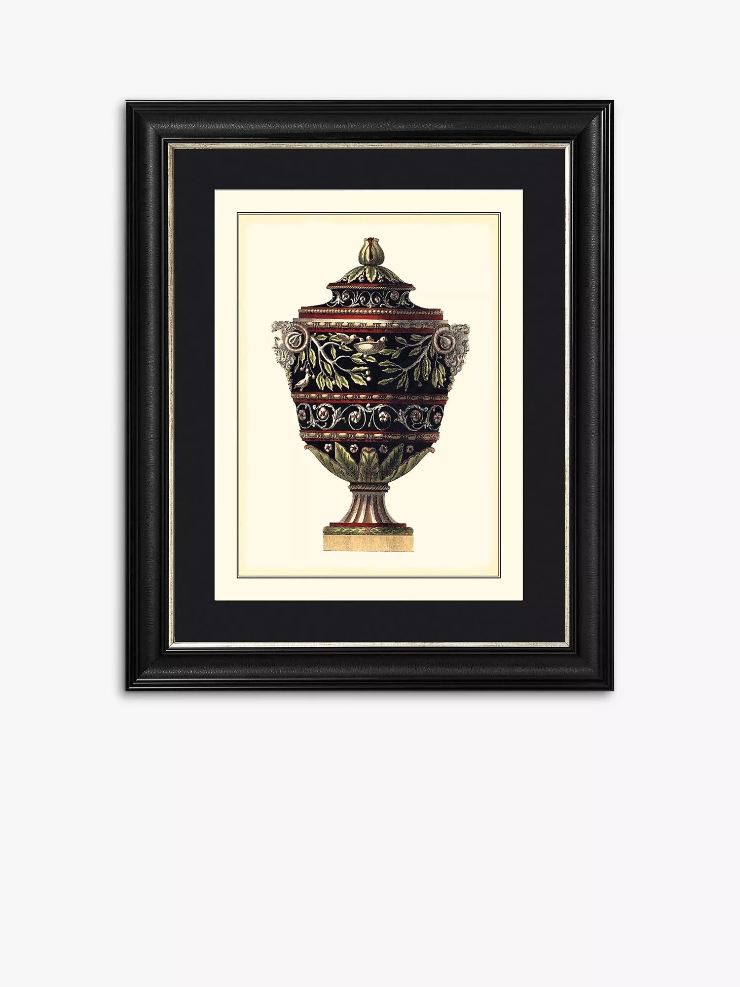 A detailed illustration of a decorative urn printed on satin photo paper and framed in a black and antique pewter moulding. The frame is made of a recycled wood composite and comes with a black mount and white core.