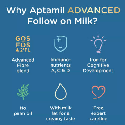 Product InformationAll reviews are from parents with children older than 6 months and have not been edited by Nutricia. IMPORTANT NOTICE: Breastfeeding is best. Follow-on milk should only be used as part of a mixed diet and not as a breastmilk substitute before 6 months. Use on the advice of a healthcare professional. Preparation instructions on pack must be followed. Apatmil® Advanced Follow On Milk, our most advanced formulation* (*contains iron to support normal cognitive development) helps meet the increasing nutritional needs of babies aged 6-12 months. The beginning of your baby's life is a special and beautiful time. Our passionate team of more than 500 scientists and experts are devoted to bringing you and your baby the latest scientific discoveries our research has to offer. Inspired by 50 years of breastmilk research we have gone a step further to develop Aptamil® Advanced Follow On Milk, which is suitable in combination with breastfeeding or for formula feeding. Supporting you on your baby's journey - Aptamil® Advanced Toddler Milk is tailored for toddlers from 1 to 3 years as part of a varied, balanced diet. - Our unique blend of GOS/FOS and 2'FL** - Essential fatty acids ALA and LA for normal growth and development*** - No artificial preservatives‡ ** GOS/FOS and 2'FL - our blend of Galacto- and Fructo-oligosaccharides with 2'-Fucosyllactose. ***Benefit obtained from a daily intake of 2g ALA ad 10g LA ‡ As required by the legislation