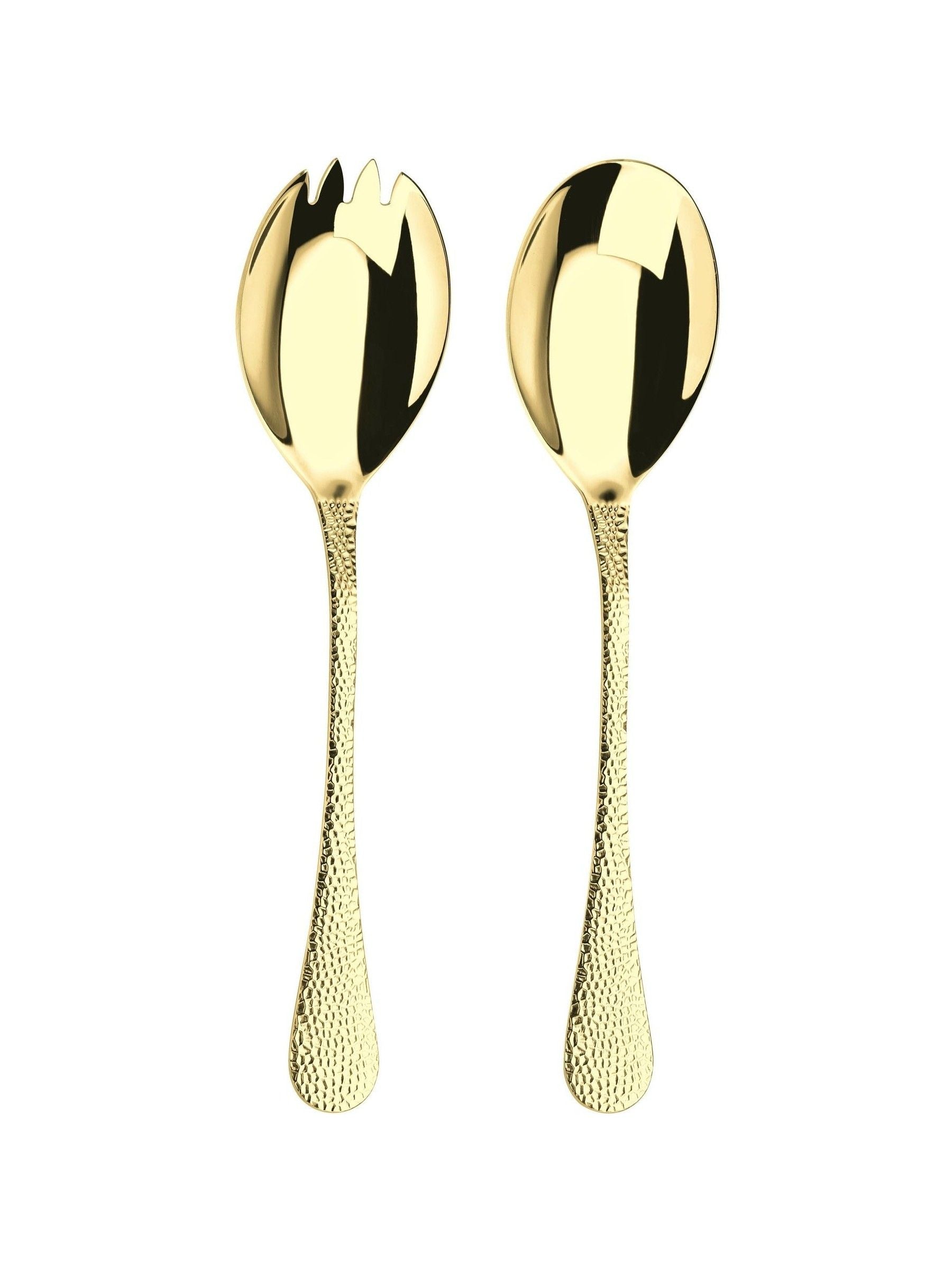Champagne Avalon beautifully combines traditional and modern design elements. Each piece has a hammered textured finish to the handle, which adds interest and perfect for catching the light and adding glamour to any table setting. Serve your salad in style with these stunning salad servers. Elegant packaging making them an ideal gift. Produced from 18/10 stainless steel, dishwasher safe and 50 year guarantee. Single Item Weights: Serving Spoon - 86g Serving Fork -85g Box Weight: 355g Product Lengths: Serving Spoon - 23.5cm Serving Fork - 23.5cm Box Dimensions: Length - 27cm Width - 14.5cm Height - 3cm