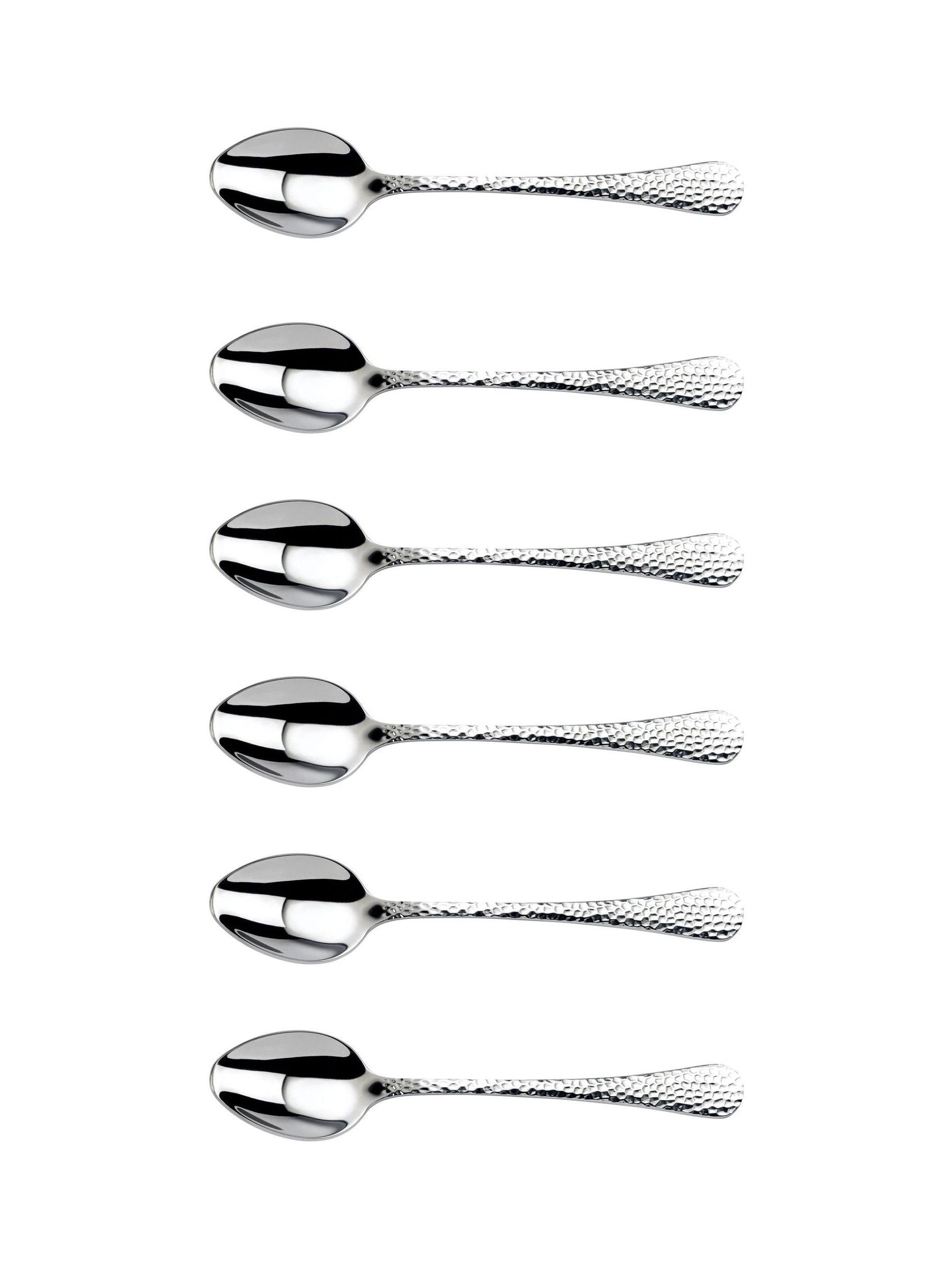 Avalon beautifully combines traditional and modern design elements. Each piece has a hammered textured finish to the handle, which adds interest and perfect for catching the light and adding glamour to any table setting. Avalon Set of 6 Teaspoons. Produced from 18/10 stainless steel, dishwasher safe and 50 year guarantee. Single Item Weight - 24g Product Length - 13.8cm Box Weight: 318g Box Dimensions: Length - 24cm Width - 16.5cm Height - 3cm
