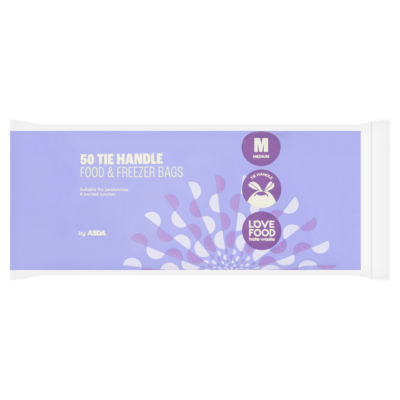 Product InformationTie handle food and freezer bags About This Product Asda Tie Handle Food & Freezer Bags are convenient and easy to use, locking in the freshness of all types of foods whilst in the fridge or freezer.