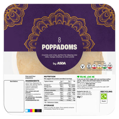 FeaturesCrunchy and crisp, perfect for dipping into raita, mango chutney or lime pickle. No Artificial Colours, Flavours or Hydrogenated Fat. Suitable for vegetarians.