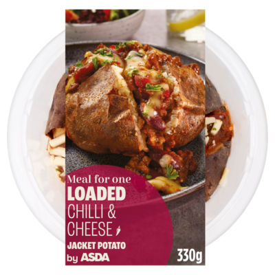 This ASDA Meal for One provides a convenient single-serving option ready for heating. It features a substantial cooked jacket potato base topped with a rich chilli cheese sauce.