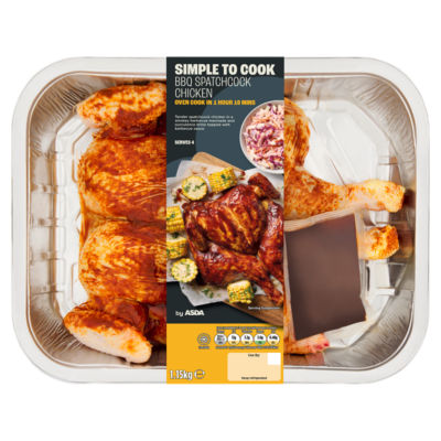 This 1.15kg ASDA Smoky BBQ Spatchcock Chicken is prepared for easy cooking and flavourful results. It comes complete with a dedicated barbecue sauce sachet to enhance the taste profile during preparation. This main course offers a convenient solution for a satisfying family dinner with minimal effort required.
