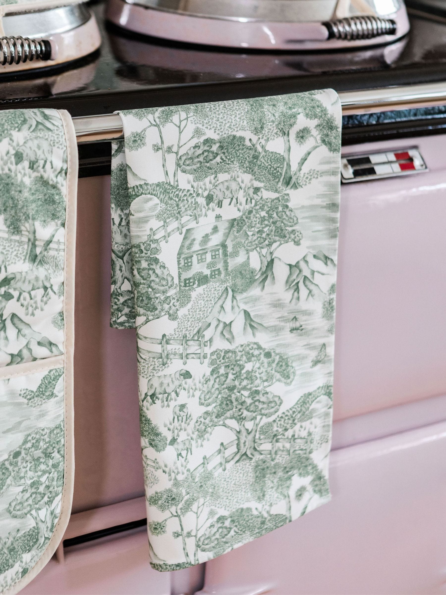 Our exclusive new Lake District Toile captures the spirit of slow living in one of Britain’s most beloved landscapes — where dry-stone walls and drifting sheep meet sailing boats and borrowed cottages. Printed in a soft green on a warm cream ground, this detailed countryside scene takes cues from traditional French toile de Jouy but swaps Versailles for valleys, mountains, and misty lakes. Made in the UK from 100% cotton, it brings a poetic touch to the table — ideal for Sunday roasts, christening lunches, or a quiet breakfast with the paper (and a pot of proper tea). Available as: tablecloths, napkins, runners, tea towels, and oven gloves. Machine washable. Best styled with buttered crumpets, ironed linen, and someone who knows how to reverse a trailer.