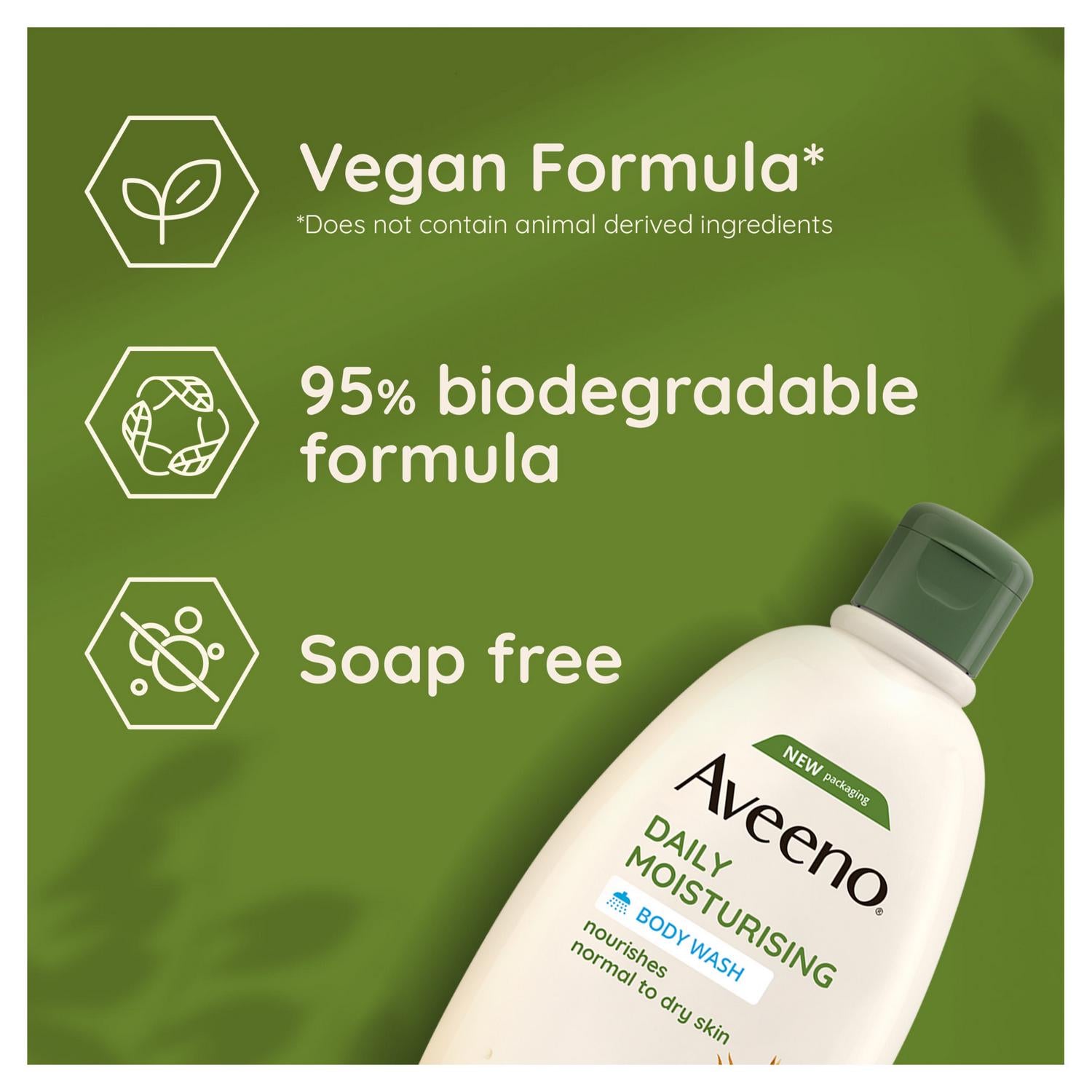 Read MoreHealthier-looking skin starts in the shower. Formulated with soothing oat helps preserve the skin's natural moisture barrier, this product gently cleanses without drying the skin, leaving it clean, soothed, and nourished. Its gentle, soap-free, vegan formula*, and 95% biodegradable formula helps maintain the balance of the skin's natural moisture barrier. Aveeno Daily Moisturising Body Wash is lightly scented and is suitable for dry, sensitive skin. Complete your routine with AVEENO® Daily Moisturising Lotion with nourishing oat for beautifully soft, more resilient skin. *does not contain animal derived ingredients