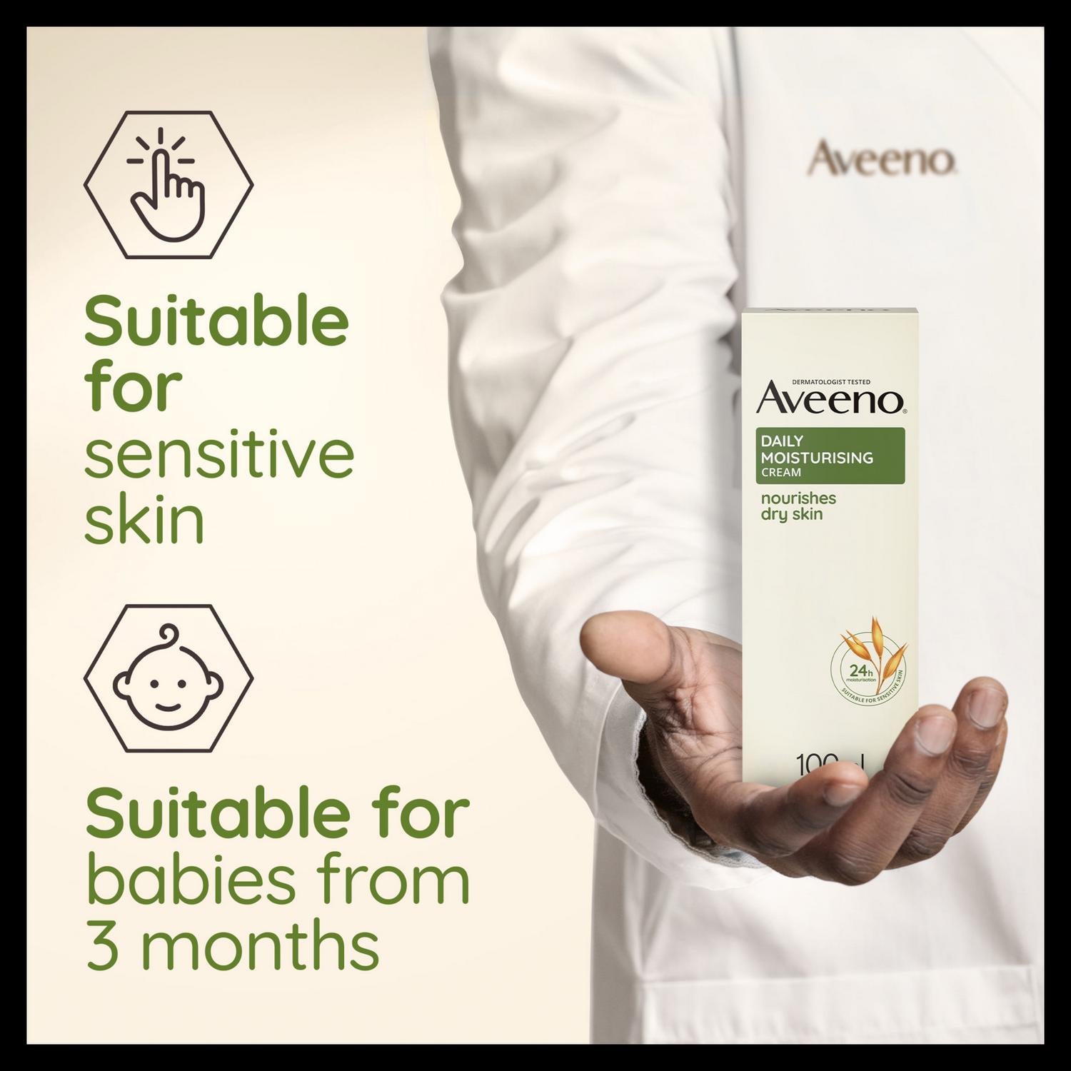 This Aveeno cream is specifically formulated to nurture and balance dry and sensitive skin. It leverages the brand's commitment to combining nature and science for effective skincare solutions. The formulation works to soothe skin and supports long-term skin health.