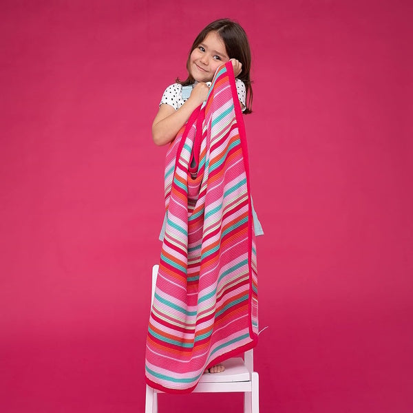 vibrant multicoloured stripes bold eyecatching stripes that add energy to any nursery premium soft cotton 100 cotton fabric gentle and safe for babys skin breathable cosy provides warmth and breathability keeping your little one comfortable versatile size 90cm x 70cm ideal for cots prams and car seats durable knit retains its softness and colour wash after wash stylish practical perfect for naps travel or as a colourful nursery accent easy care machine washable for everyday convenience add a touch of vibrant charm to your little ones nursery with the pink striped knit blanket featuring striking multicoloured stripes this beautifully knitted blanket blends playful energy with stylish sophistication the rich colourful stripes bring warmth and life to any room making it the perfect accessory for a cosy modern nursery crafted from 100 soft cotton this blanket is gentle on delicate skin providing the ideal balance of warmth and breathability whether your baby is napping strolling in the pram or relaxing in the cot this blanket ensures yearround comfort without the risk of overheating sized at 80cm x 100cm its perfect for a variety of uses from cuddly naps to adding an extra layer of warmth onthego its durable construction guarantees lasting softness and vibrant colours even after multiple washes making it a practical yet fun addition to your babys essentials elevate your babys comfort with the pink striped knit blanket a charming blend of fun and functionality