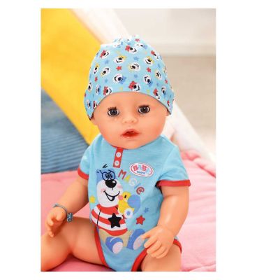 BABY born Magic Boy with romper and hat. Includes 10 accessories; birth certificate, bracelet for doll and child, bottle, dummy, nappy, plate, spoon, potty and food for endless fun. Styles may vary.