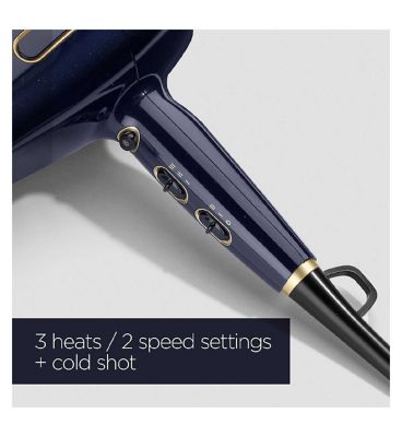 Ionic technology with black onyx infused ceramic controls frizz and leaves hair ultra smooth with a beautifully shiny finish. With a choice of 3 temperatures and 2 airflow settings for a customised blow-dry to suit your style.