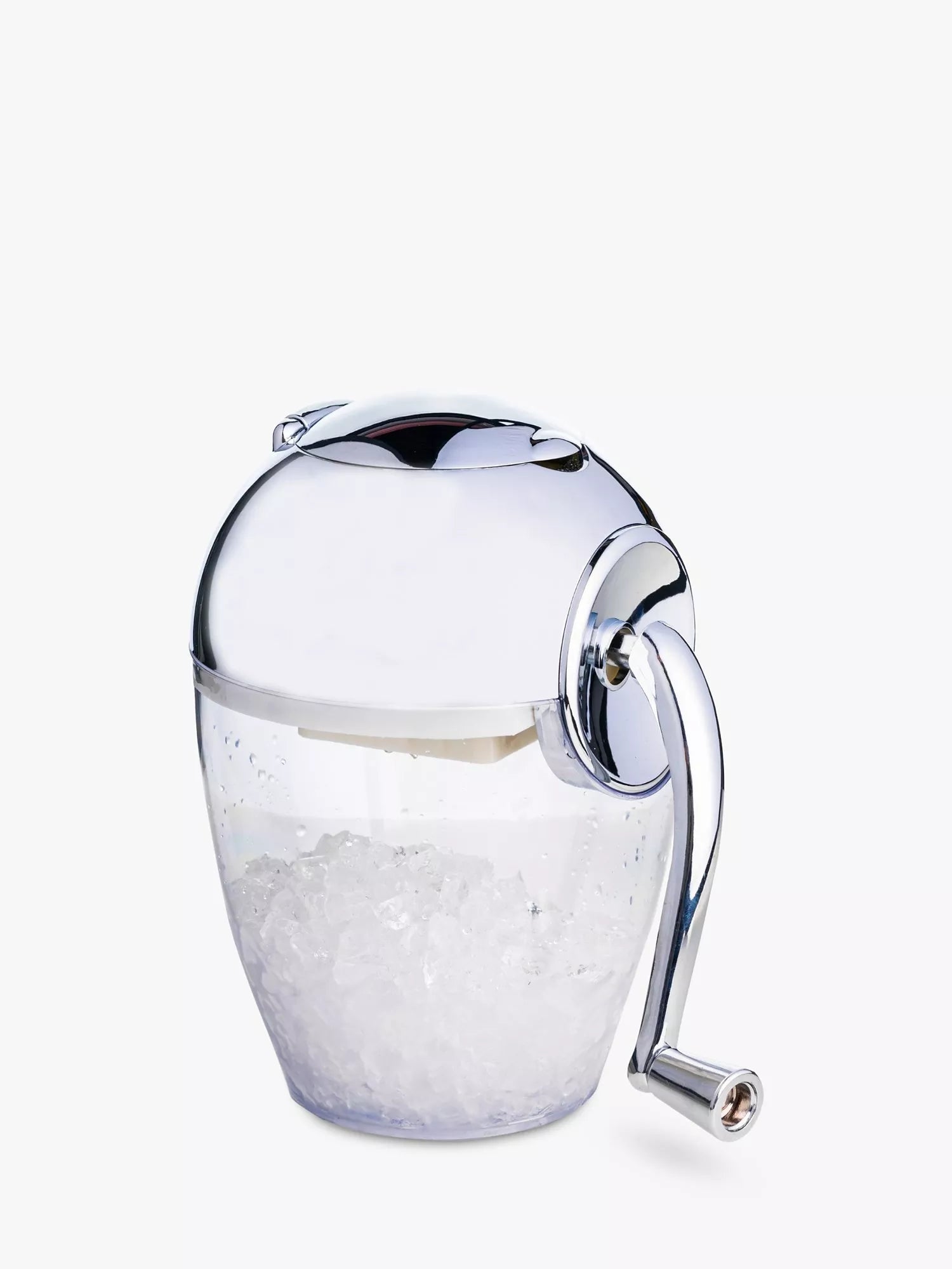 The chrome-plated lid, clear acrylic base, stainless steel jaws and retro curved design, combine style and functionality in one sleek package. Just load with ice cubes, turn the crank and fine, crushed ice (not shavings) will fall into the dispenser. Use the dispenser as an ice bucket for serving your drinks.