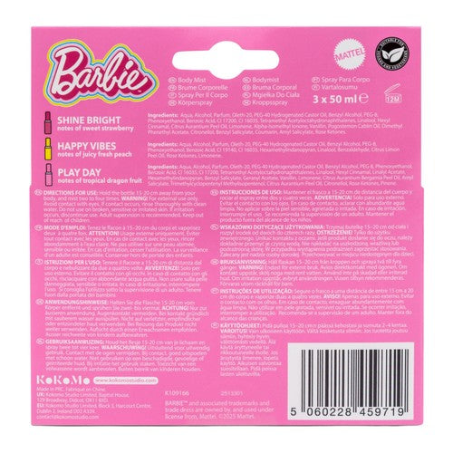 Refresh your routine with the Barbie Body Mist Trio, a collection of three light and fruity fragrances designed for daily enjoyment. This set includes distinct scents of peach, strawberry, and dragonfruit, each contained within a convenient 50ml bottle. Each mist provides a quick application of uplifting aroma, helping you maintain a feeling of freshness all day long.