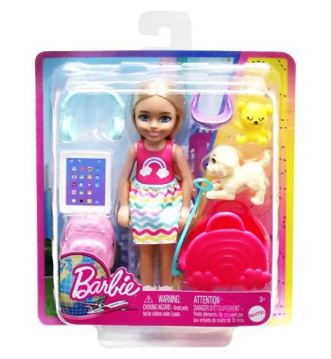 Imaginations can dream up their own big adventures with Barbie dolls and playsets! Little sister Chelsea doll is ready to set off on her next destination with her puppy and six travel accessories that include a pet carrier. With so many ways to inspire imaginations to take off, this doll set makes a great gift for kids ages 3 years old and up. Doll cannot stand alone. Colours and decorations may vary.
