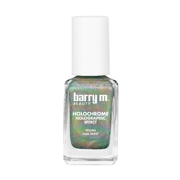 Enhance your nails with Barry M's Holochrome nail paints, featuring a captivating, multi-dimensional shimmer that shifts with every angle. From silver gleams to prismatic pops of color, these paints bring a cosmic touch to your fingertips, offering a bold, futuristic finish.