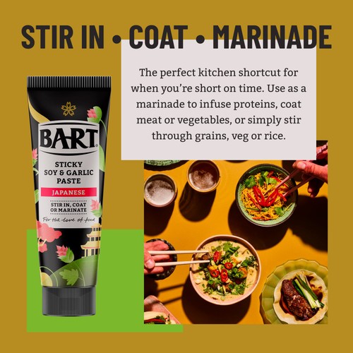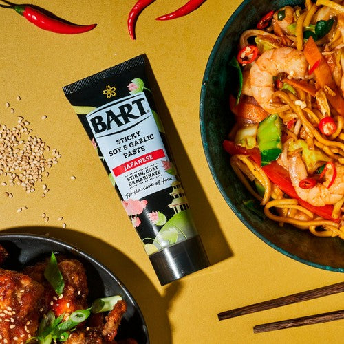 Bart presents their Japanese Sticky Soy & Garlic Paste, designed to impart rich, complex flavour quickly into your cooking. This concentrated condiment blends savoury soy notes with aromatic garlic for authentic taste inspiration. The convenient tube packaging simplifies usage when preparing diverse dishes.