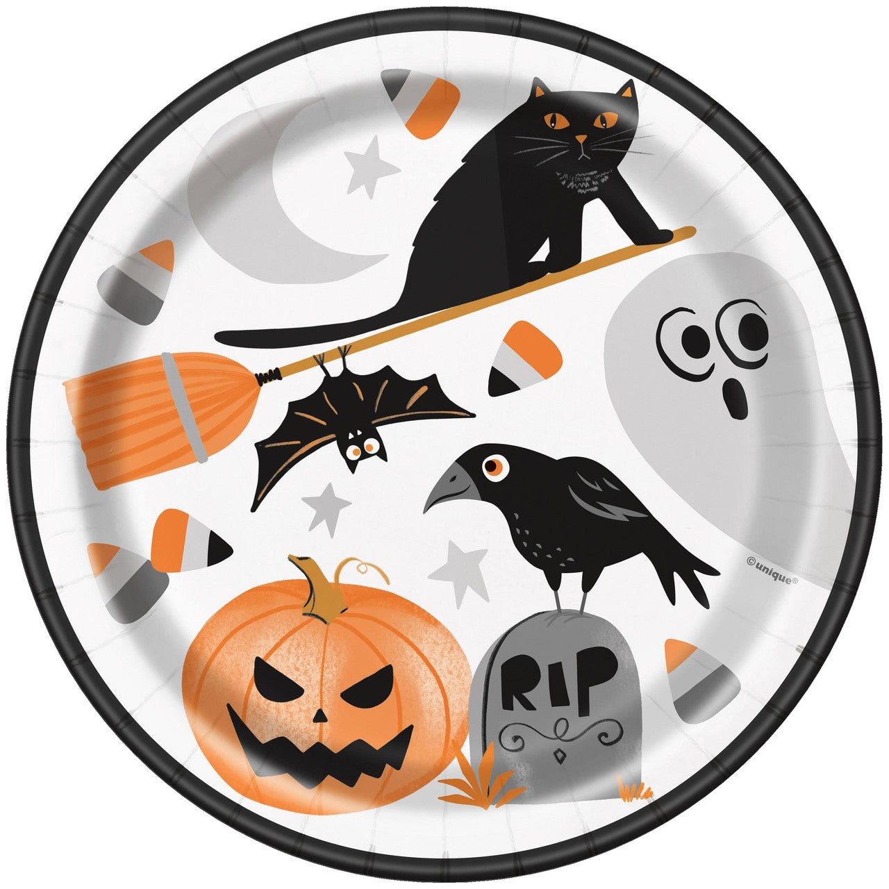 Prepare for your annual spooky celebration using these festive Bats & Boos Halloween paper plates. Measuring 22.86cm, these items are sized appropriately for serving various ghoulish treats during your gathering. They offer practical use combined with a strong seasonal visual theme for your event.