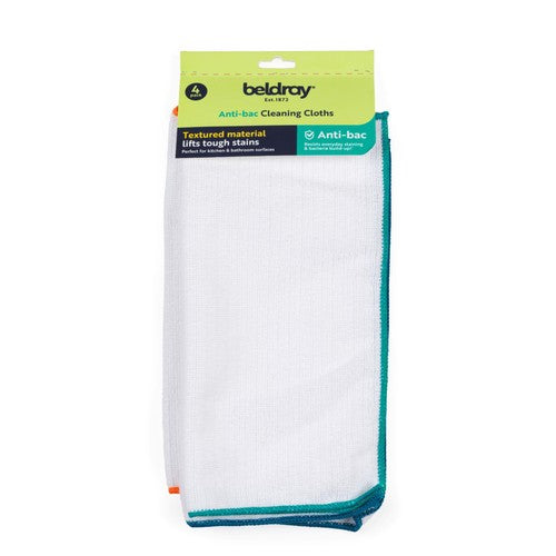Read MoreKeep your home wonderfully clean with these fantastic Beldray Anti-Bac Cloths, ideal for cleaning your kitchen and bathroom. Made with a zinc pyrithione treatment that resists everyday staining and bacteria build up, the cloths will keep items cleaner and fresher for longer. Featuring a textured material, the cloths are ideal for removing tough stains or dusting your worktops whilst leaving them with a streak-free shine. Washable and reusable, this pack of 4 cloths are essential for any home.