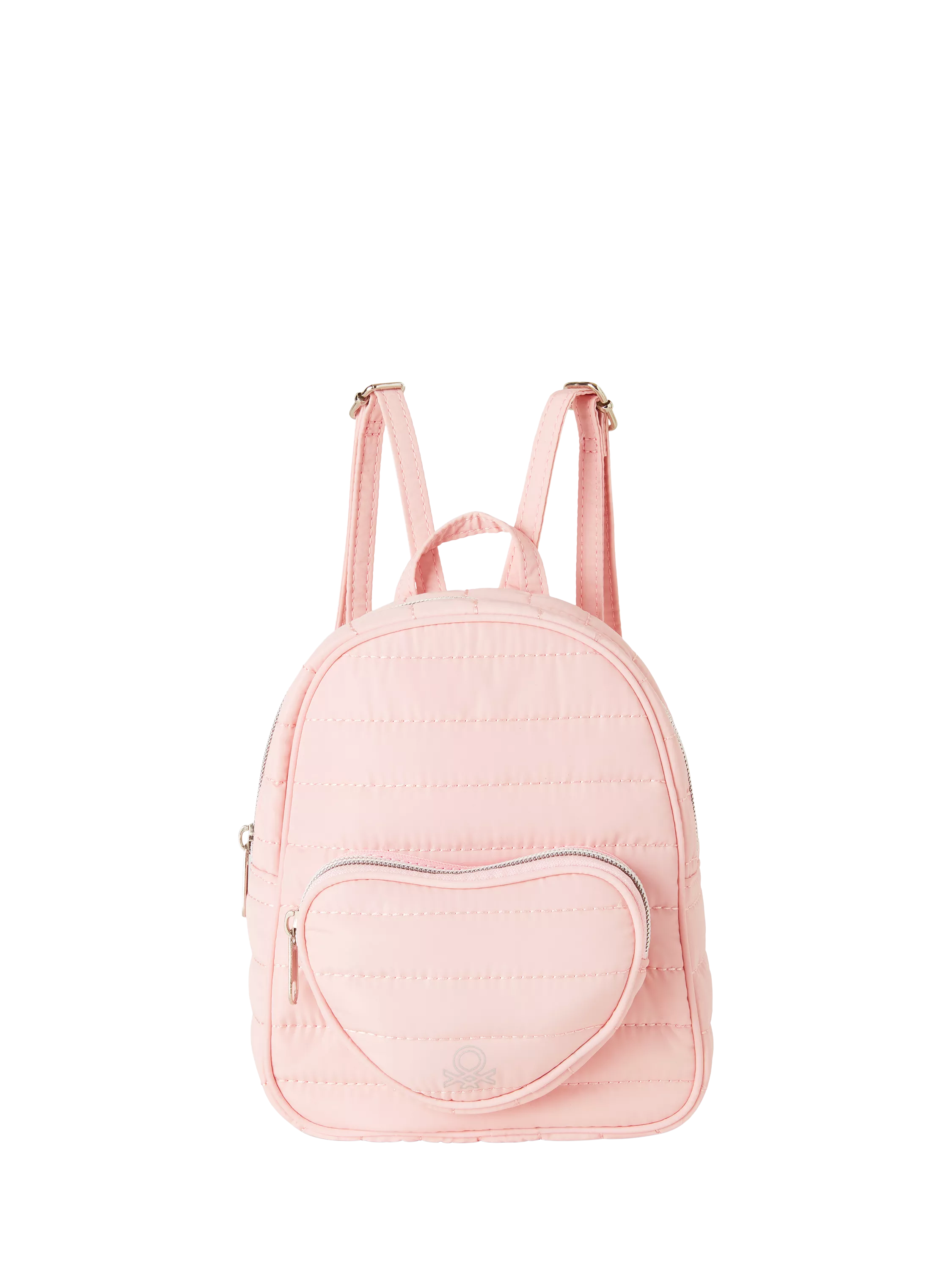 A padded and quilted backpack, designed with adjustable shoulder straps and a small heart-shaped pocket on the front panel.