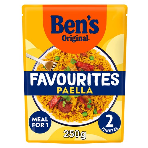Ben's Original Favourites Paella delivers a satisfying ready meal built around risotto rice blended with chorizo, red peppers, and peas. This convenient single-serving dish offers rich, robust flavour suitable for an instant lunch or a quick dinner solution.