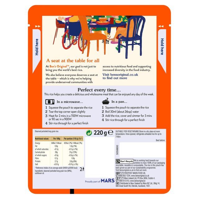 Ben´s Original⢠Long Grain microwave rice is simple and versatile; one of our classics. Prep and clean-up is a breeze with this microwaveable pouch, and since it heats up in just 2 minutes, youâll have a tasty meal in no time! Ben´s Original⢠microwaveable Long Grain rice helps you create a delicious and wholesome meal that can be enjoyed any day of the week. Why not try it with chilli con carne, in a colourful buddha bowl, or even something of your own imagination!