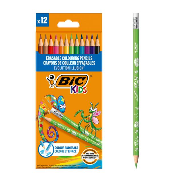 Product details Description A set of 12 BIC Kids Evolution Illusion colouring pencils in assorted colours that easily erase with hardly a trace These pencils for children have a ringed eraser end for instantly and accurately rubbing out mistakes Their extra-strong 2.8 mm lead evenly writes with vivid colour for... Read More
