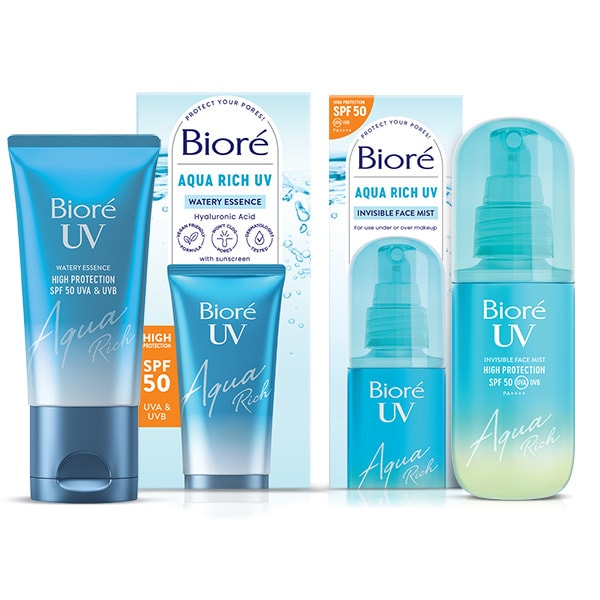 Biore Aqua Rich UV Watery Essence Sunscreen SPF 50 50ml Delivers the ultimate UV protection and weightless moisture in one. With Hyaluronic Acid, this oil-free sunscreen suitable for all skin tones, absorbs in an instand and won't clog pores.Biore Aqua Rich UV Invisible Face Mist SPF 50 60ml Top up with Biore Aqua Rich UV SPF 50 Invisible Face Mist throughout the day for invisible, even, seamless coverage and high sun protection. From the #1 SPF brand in Japan*.